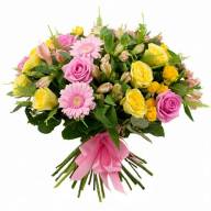 Красивый букет в розовых и желтых цветах мгновенно запоминается и откладывает приятный отпечаток на сердце. Состоит композиция из маленьких гербер (гермини), роз и альстромерий. Букет на языке цветов означает простоту, изящество, искренность и ненавязчивость. Такая композиция подойдет друзьям, коллегам или любимым, яркие эмоции и позитив гарантированы.